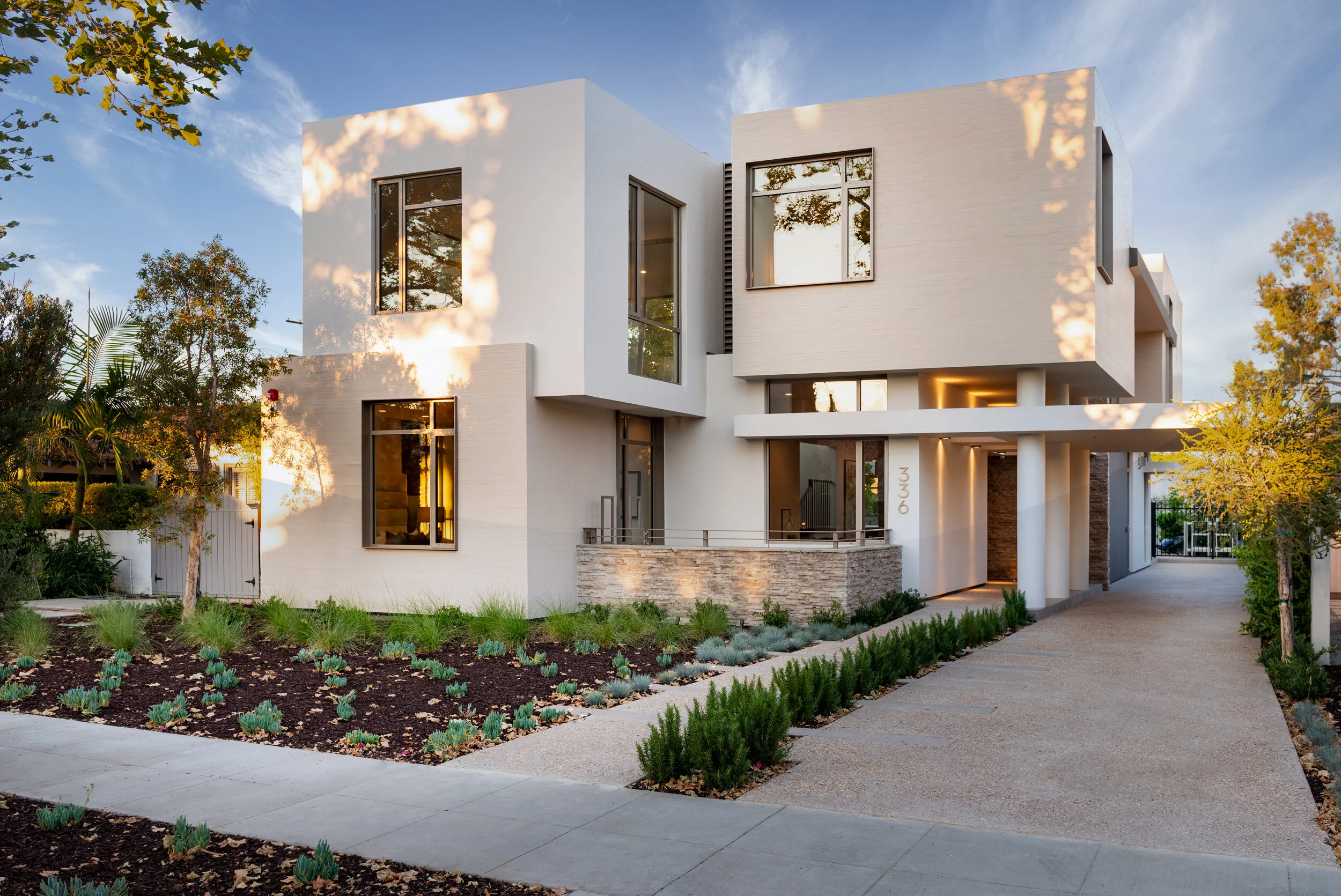 In combination with the hardscape and entry design it creates a buffer from the street and private garden for the main house.